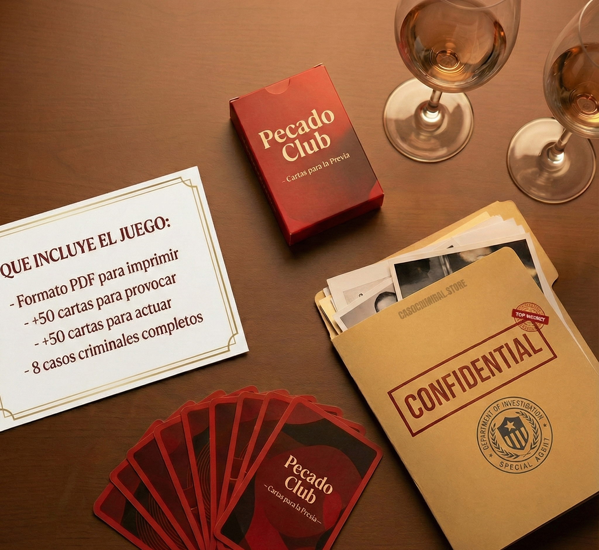 Te llevás el pack completo por el precio de uno: 8 Casos Criminales Completos (Misterio) + 50 Cartas de Previa (Conversación) + 50 Cartas de Acción (Intimidad). Es más barato que una cena afuera y te rinde para muchas noches.